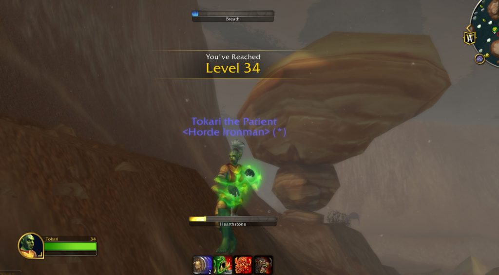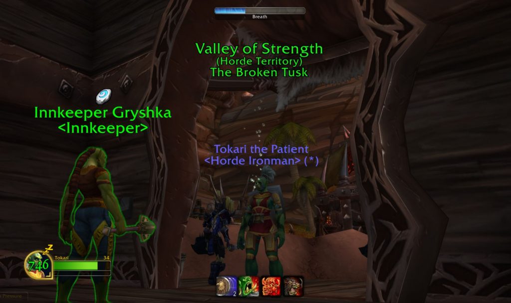 Most of Tokari’s travels were pretty safe, and she was careful, but there were a few doozies! There were several choice encounters with murlocs early on in her travels, and with some elites and Alliance guards when she ventured too close to an outpost one time… (Those Kor’kron orcs in the Barrens are vicious, too…) But her closest call was when she got a little too comfortable stress-testing her lung capacity in Thousand Needles, swimming further and deeper to collect just one more herb… and it almost cost her her life—if she didn’t have her hearthstone, she would have been fish food! She was still breathing bubbles upon warping back to the Broken Tusk in Orgrimmar, and I captured this fantastic memory of that, which you can see below! In that second image, Tokari’s health is lower than maximum, indicating that while teleporting, she had actually started to drown…😬 I tell you what; she was much more careful after that!😅